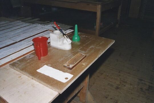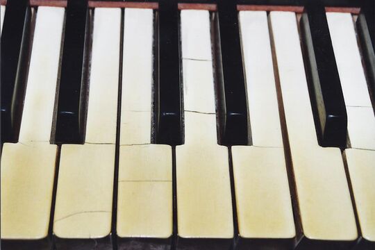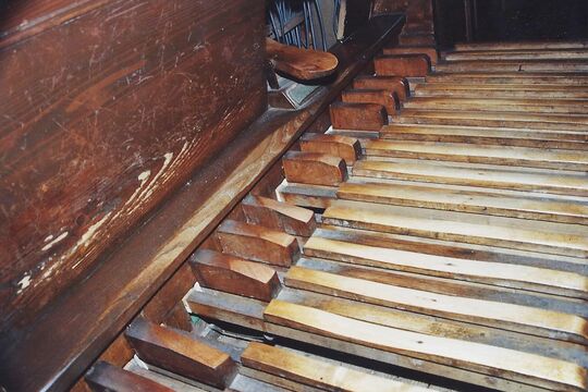 Gebrochen und abgenutzt; die Kunststoffbeläge der Manulklaviaturen. Wegen zwischenzeitlicher Lieferschwierigkeiten des originalgetreuen Elfenits, eines frühen Kunststoffs, wurden die Tasten mit Beinbelägen besetzt.