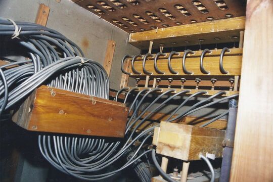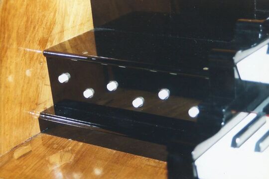 Die Sockel und Registerschweller-Anzeigeknöpfe, wie andere Teile der Spielhilfe dem Umbau der 1970er Jahre zum Opfer gefallen, wurden in mühevoller Kleinarbeit rekonstruiert.