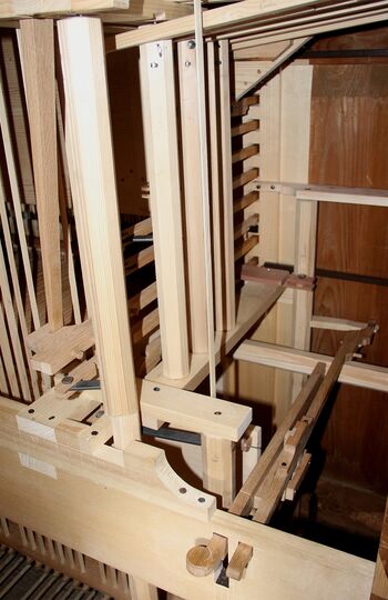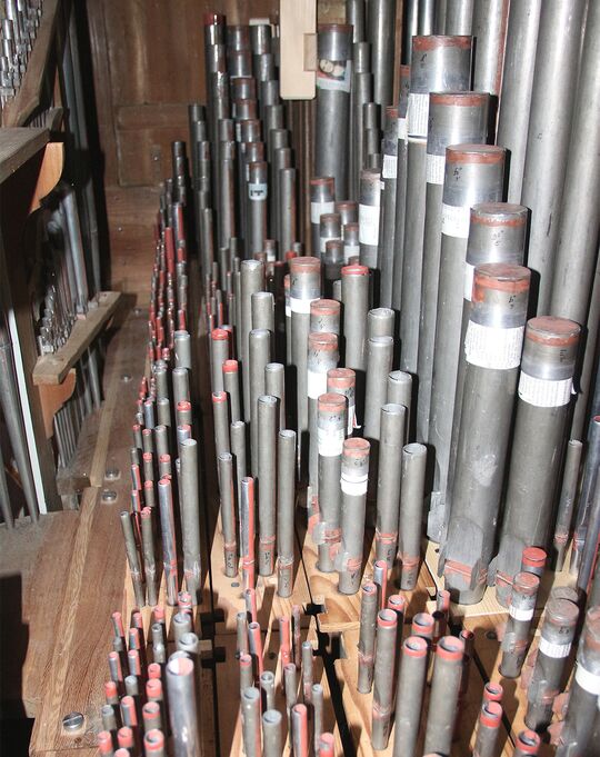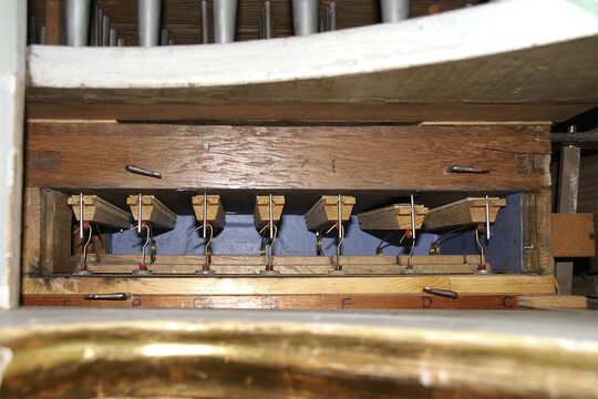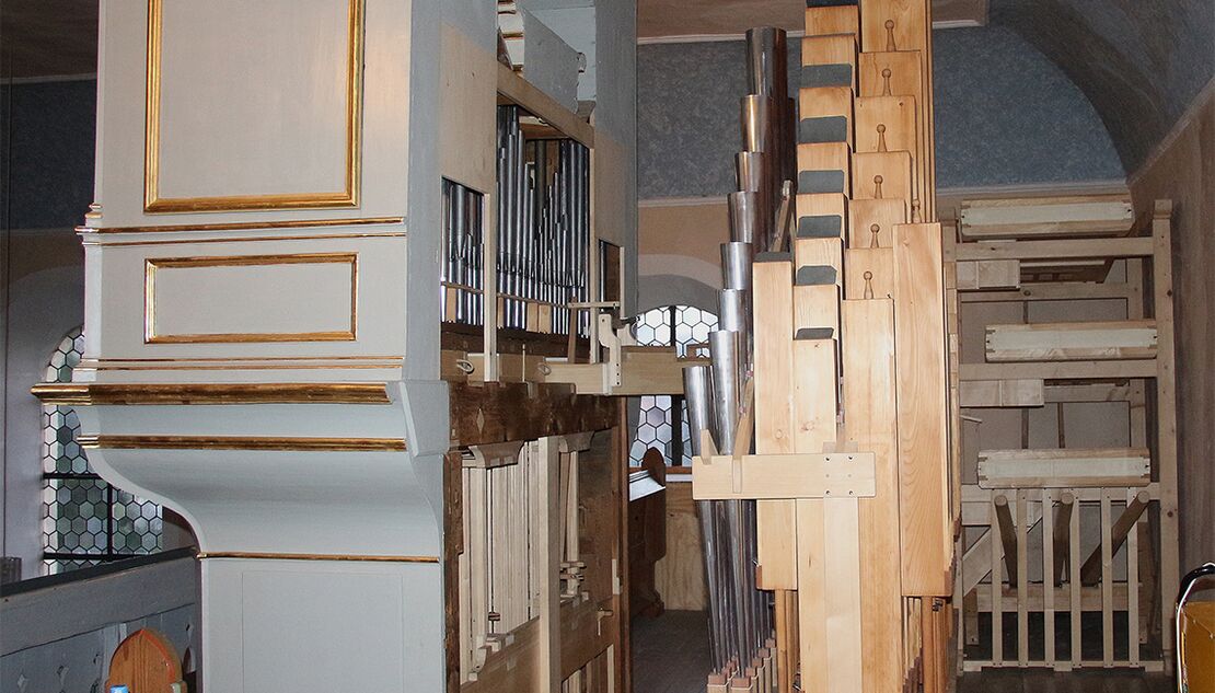 Unsere Arbeiten (2014/15) umfassten die Restaurierung des Gehäuses (einschließlich Rekonstruktion des Spielbereichs) und der Manuallade (u. a. Rekonstruktion der Windkästen), den entsprechenden Neubau einer Pedallade (mit erweitertem Ton- und Registerumfang), den Neubau der Trakturen nach Kohlhaaßschen Merkmalen, die Rekonstruktion der Keilbalganlage, die denkmalsgerechte Restaurierung und Ergänzung des erhaltenen Pfeifenwerks und die Intonation im Sinne des Erbauers.
