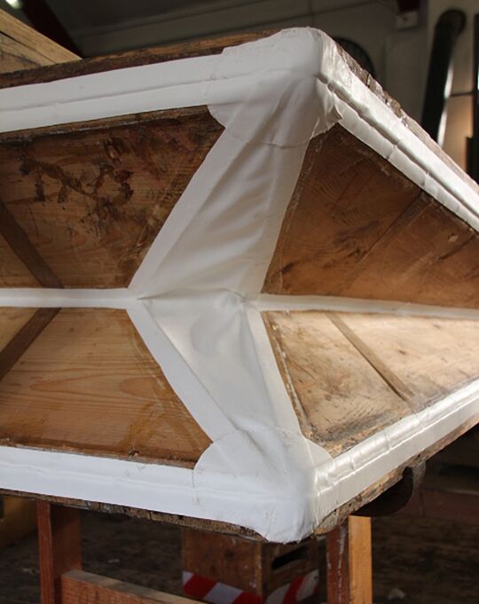 Der restaurierte Kanzellenkorpus: erkennbar Spunde neu eingesetzten Eichenholzes