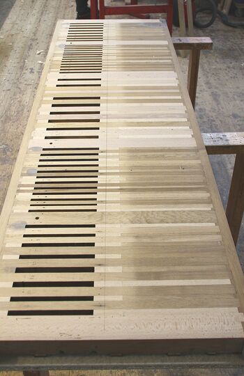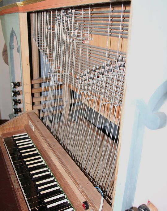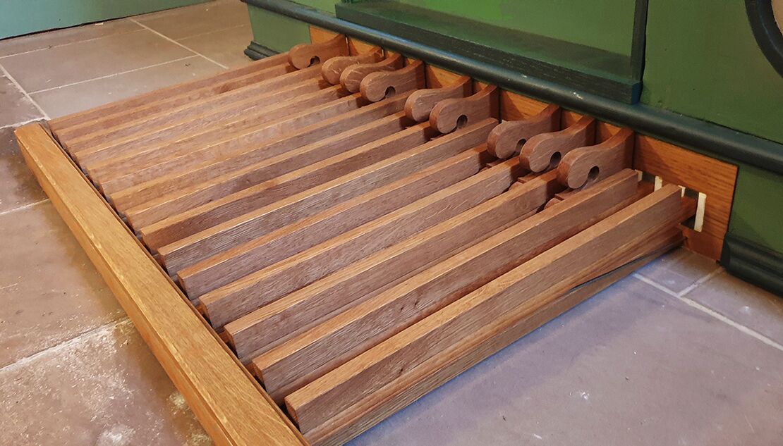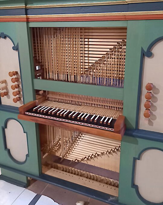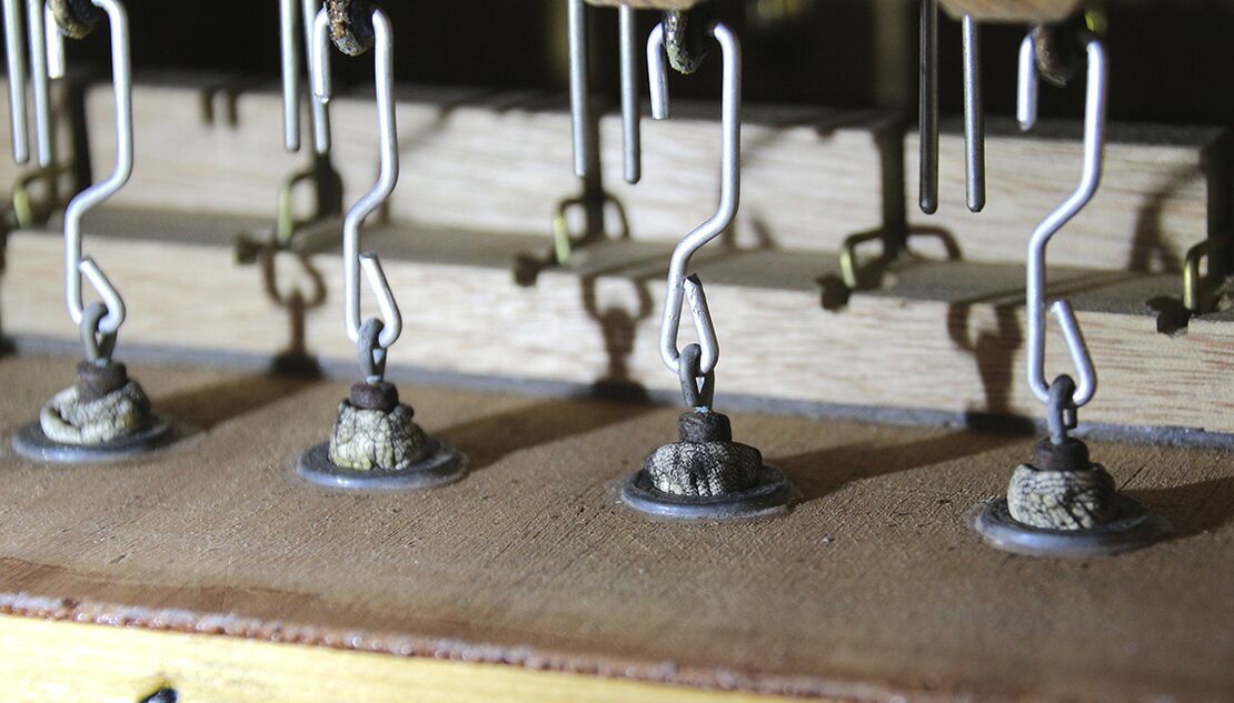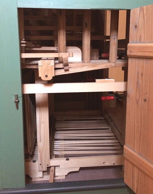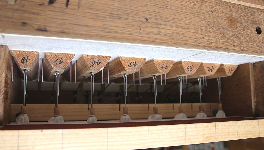 Aufbau in der Kirche: rekonstruierte Tontrakturen von Manualwerk und Koppel; oberhalb der Manualtasten die Trakturtrennung der Transponiervorrichtung
