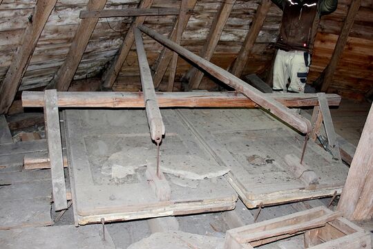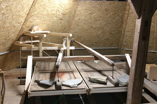 Restaurierte Winderzeugung, über Rollen und Tauwerk mit der Tretvorrichtung in der Kirche verbunden