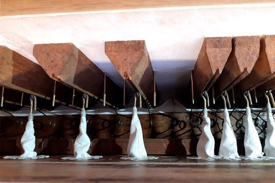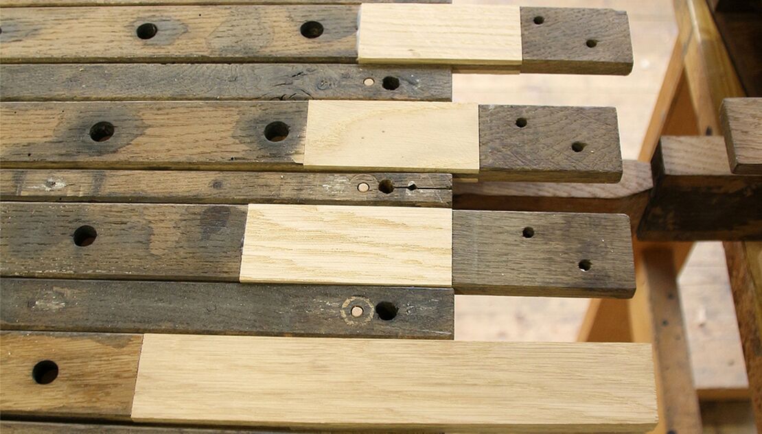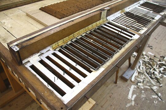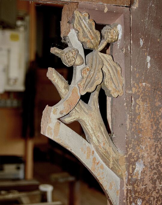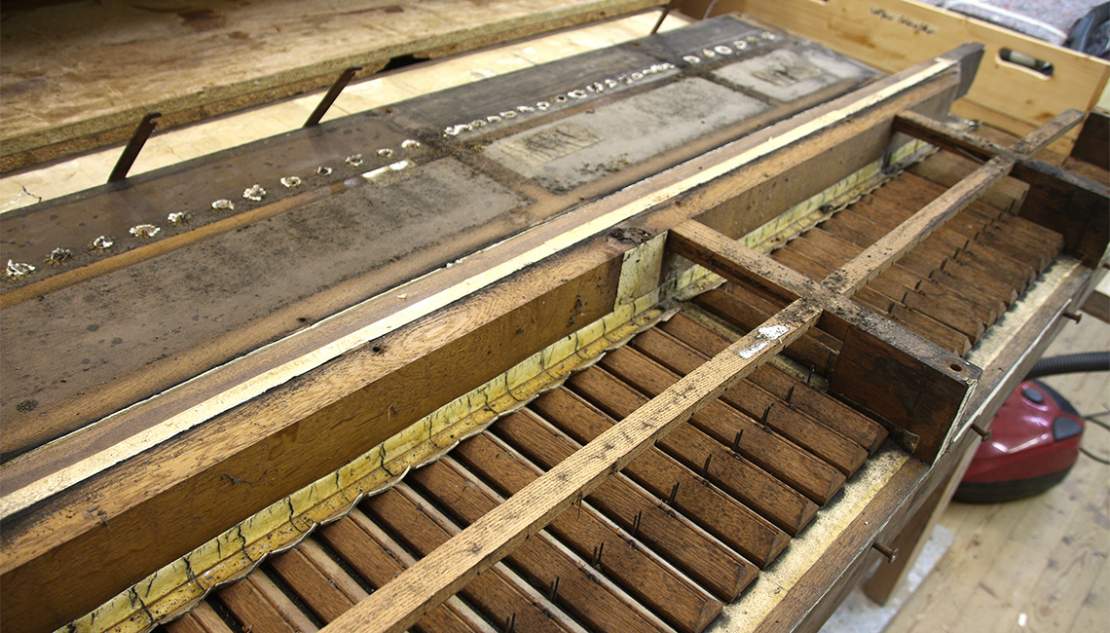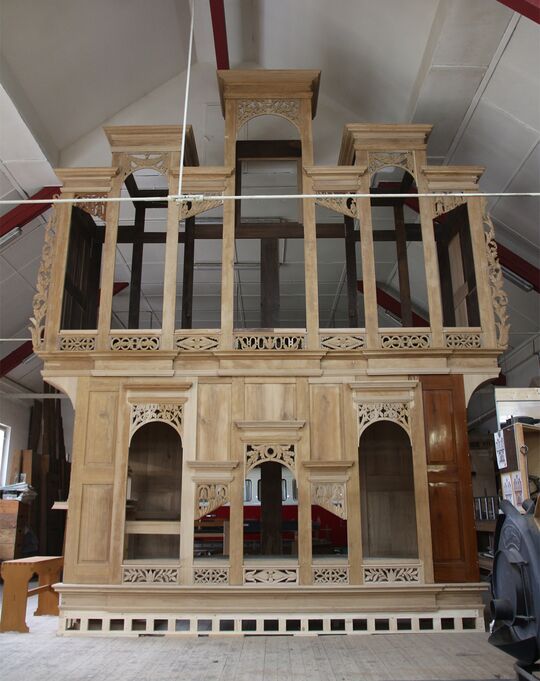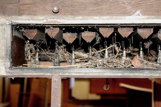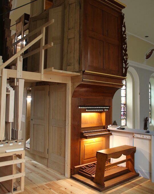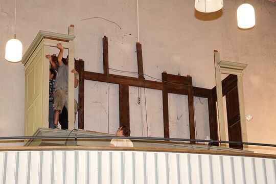 Nach Rückversetzung, Erneuerung der Windversorgung und dispositionellen Eingriffen im späten 19. und frühen 20.Jh. war das Instrument 1964 abgerissen, das Obergehäuse als Atrappe an der Kirchenwand installiert und das übrige Instrument in wesentlichen Teilen eingelagert worden (verschiedene Scheunen).