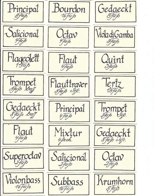 | V. di Gamba | 8’ | Flaut | 4’ | Subbass | 16’ |