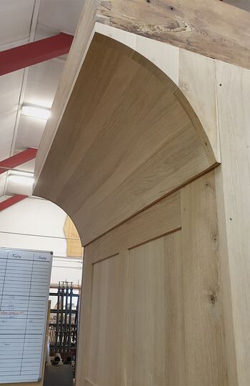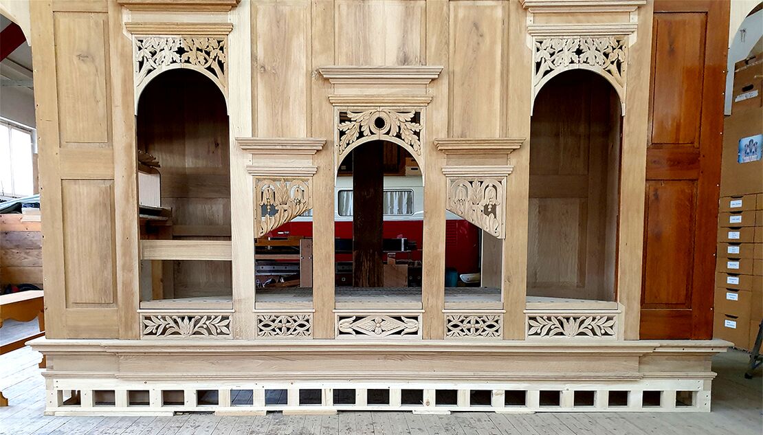 Obergehäuse im Vorzustand (1964 – 2014) als Verblendung der Elektroniumsboxen – nur ein Schatten des originalen Instruments - als Atrappe an der Kirchenwand installiert